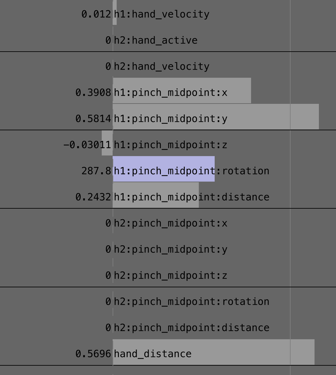 null1doit faire apparaître un graph de valeurs. Si vous zoomez surnull1vous verrez le nom des valeurs apparaître, commehand_velocity. Au milieu de ces valeurs il y a celle qui nous intéresse —hand_distance, et nous devons la sélectionner.